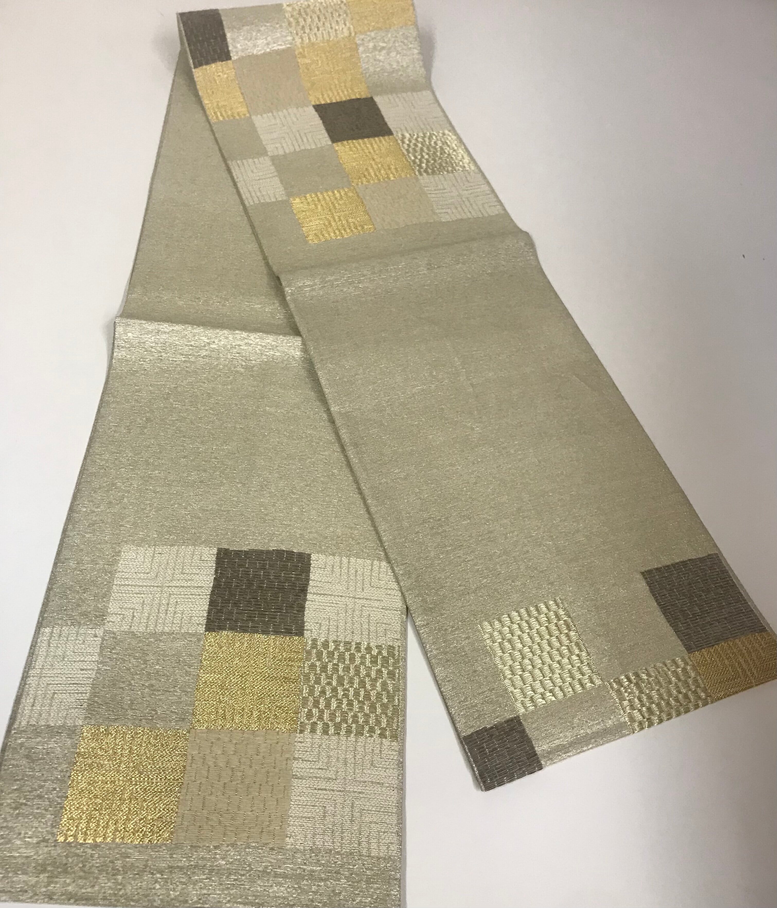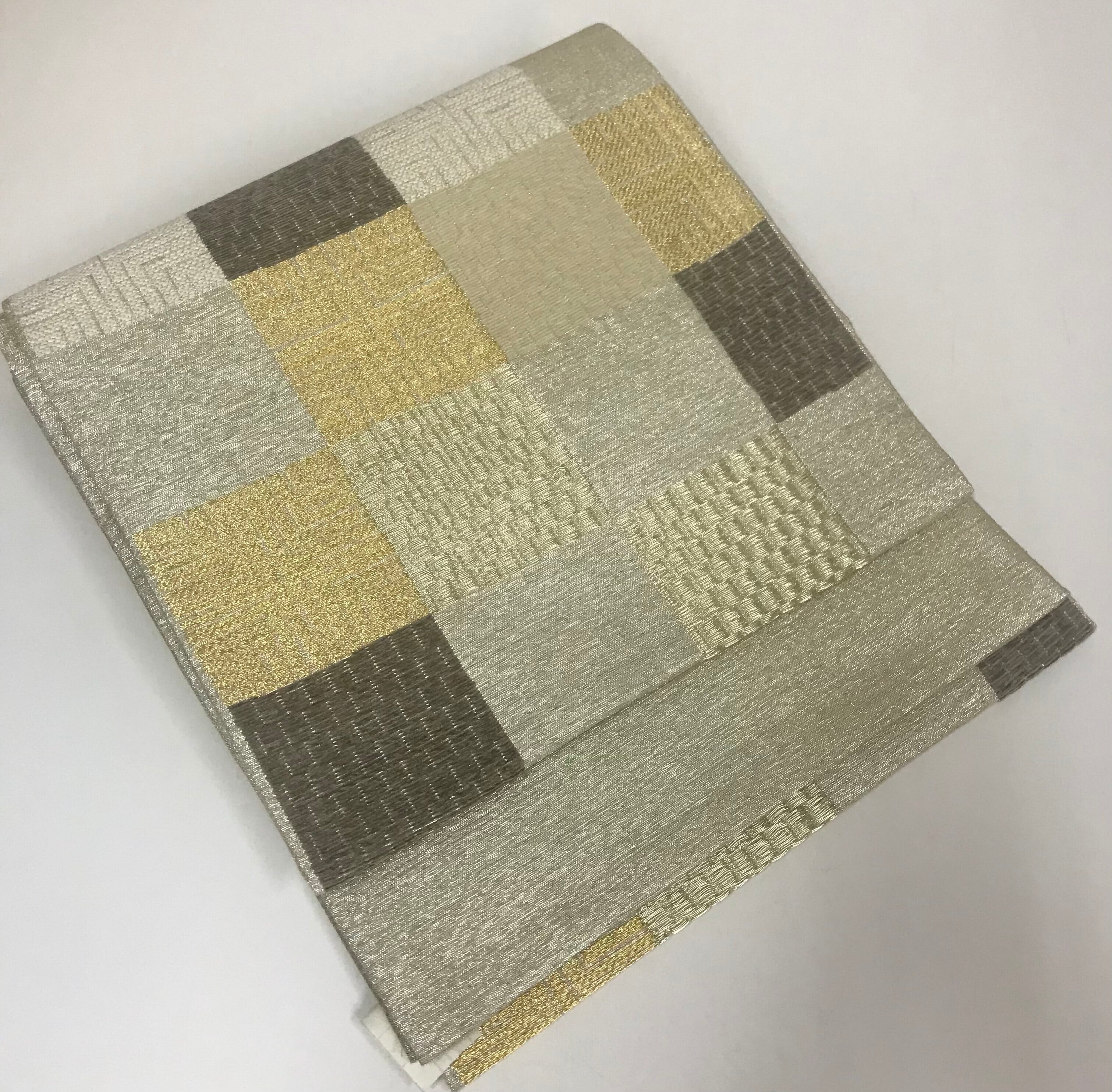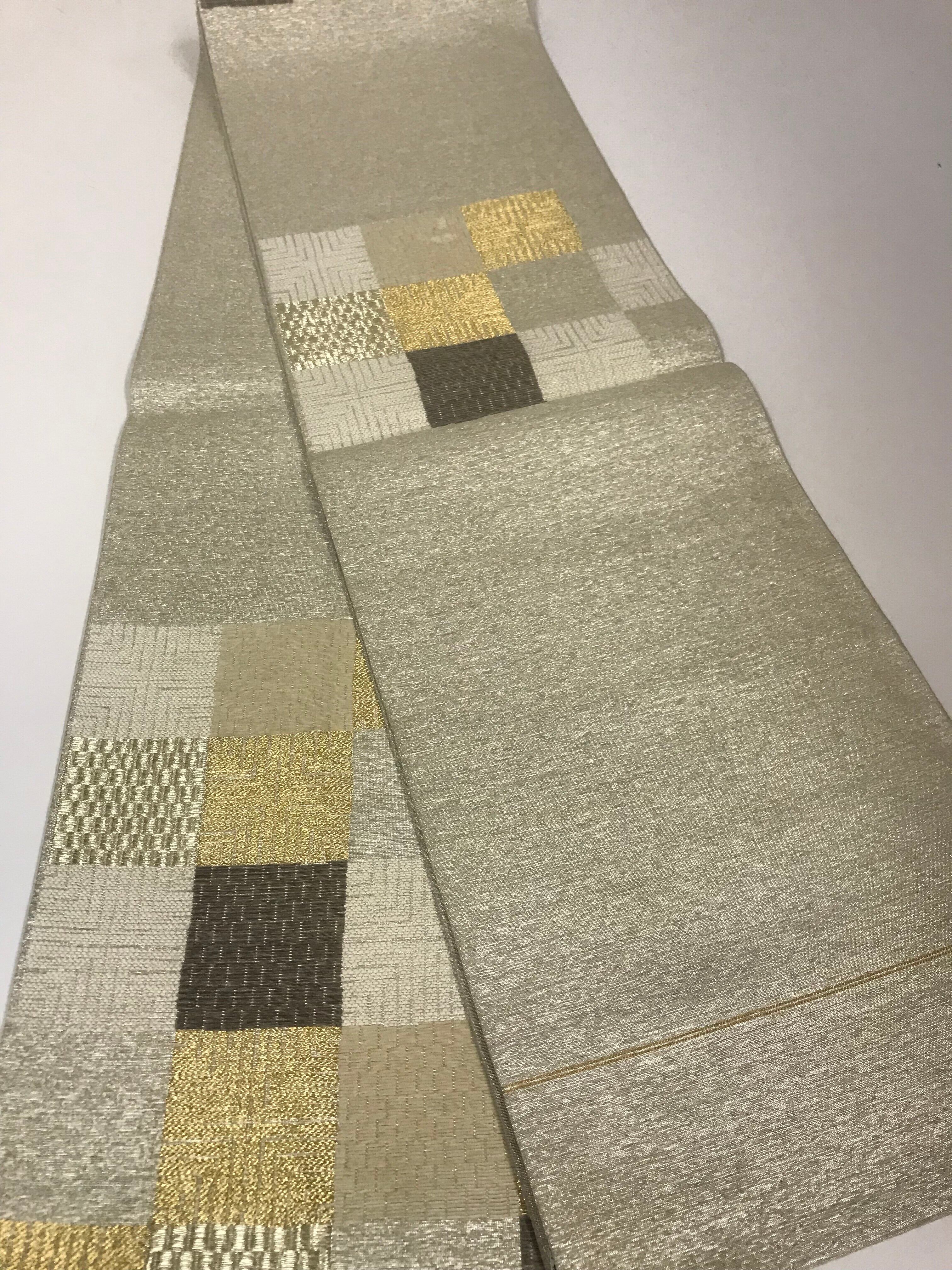 金地にチェッカーフラッグのようなモダンな帯は軽くて、締めやすい袋帯でございます。