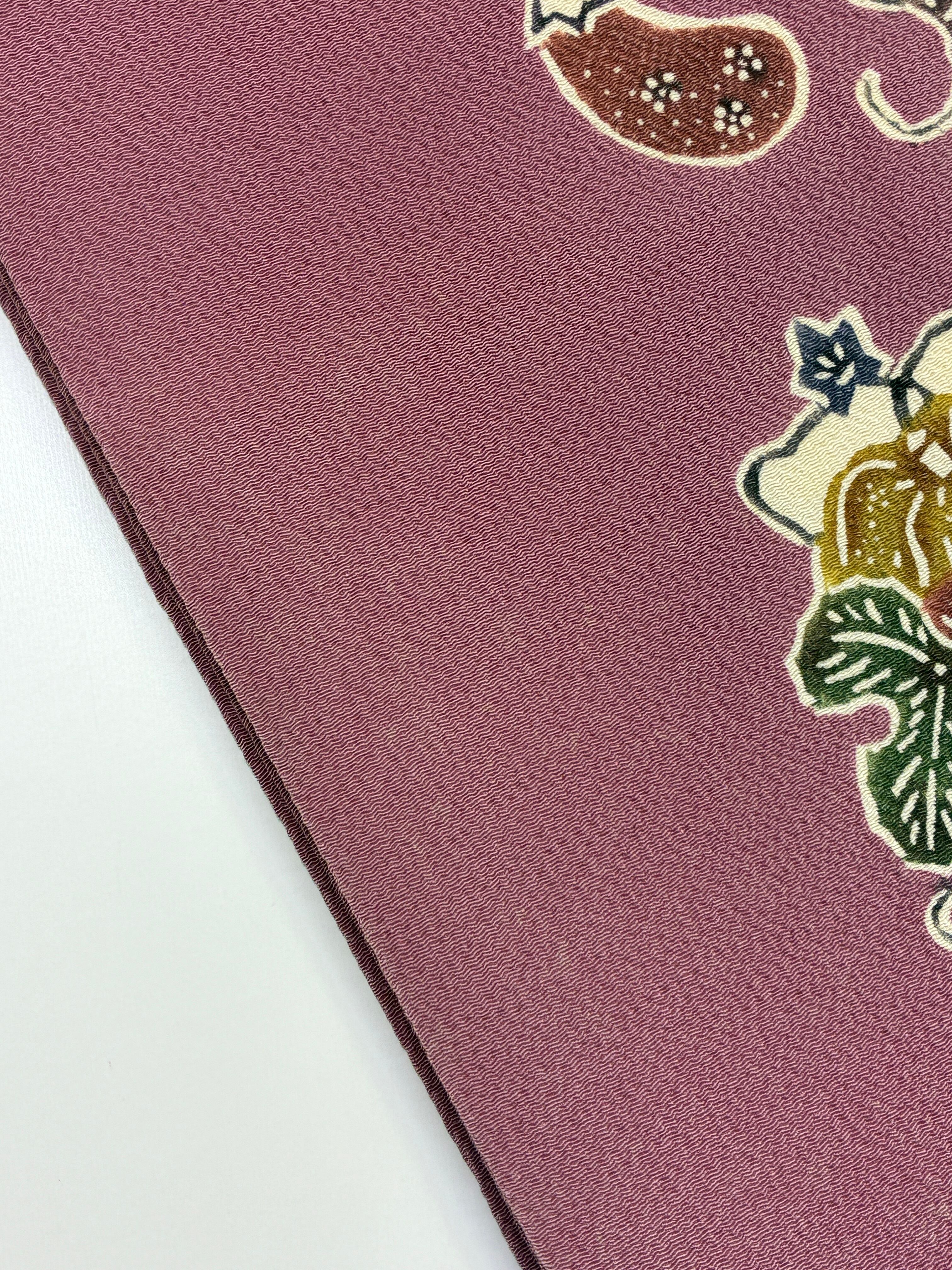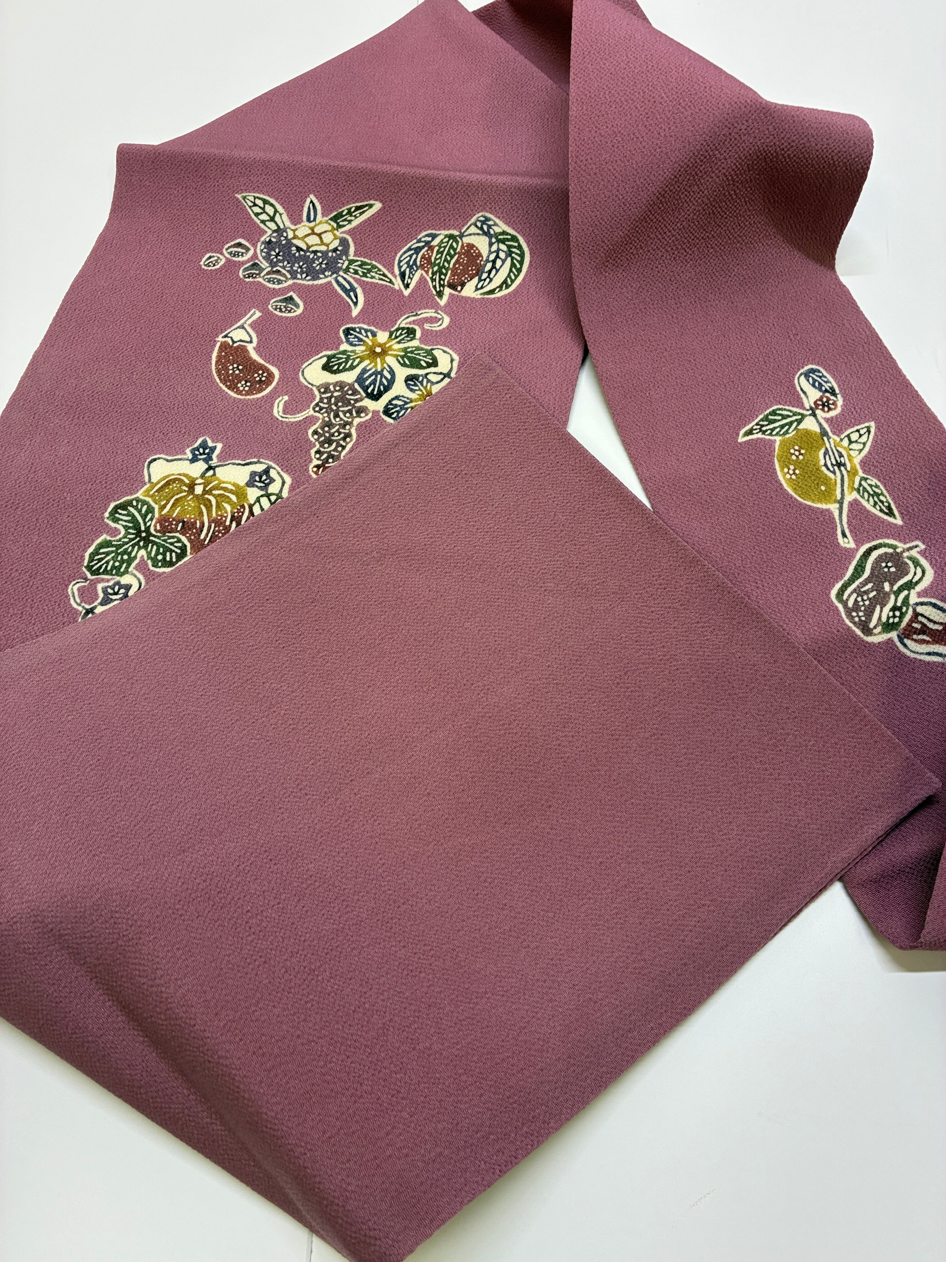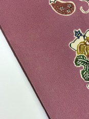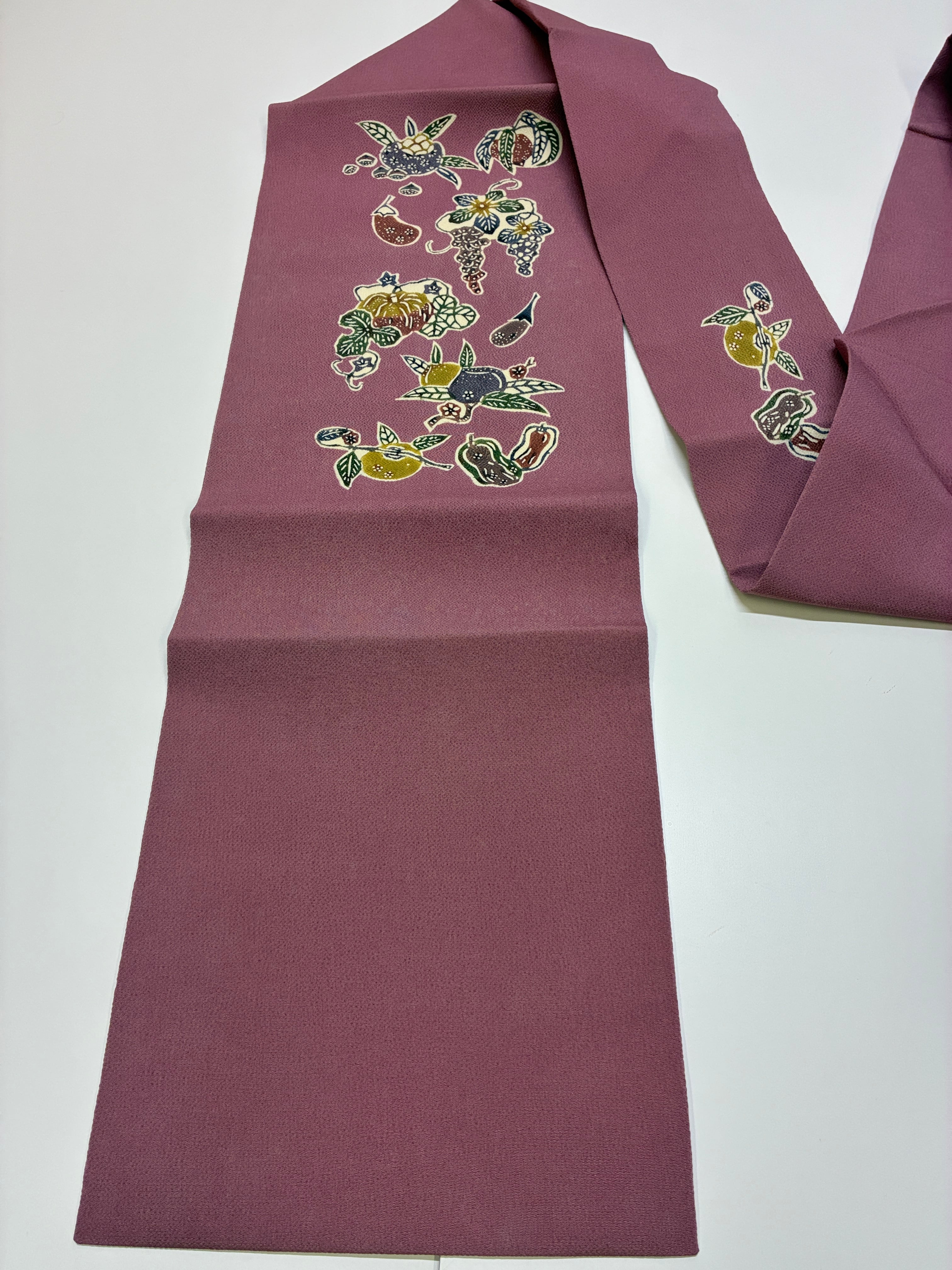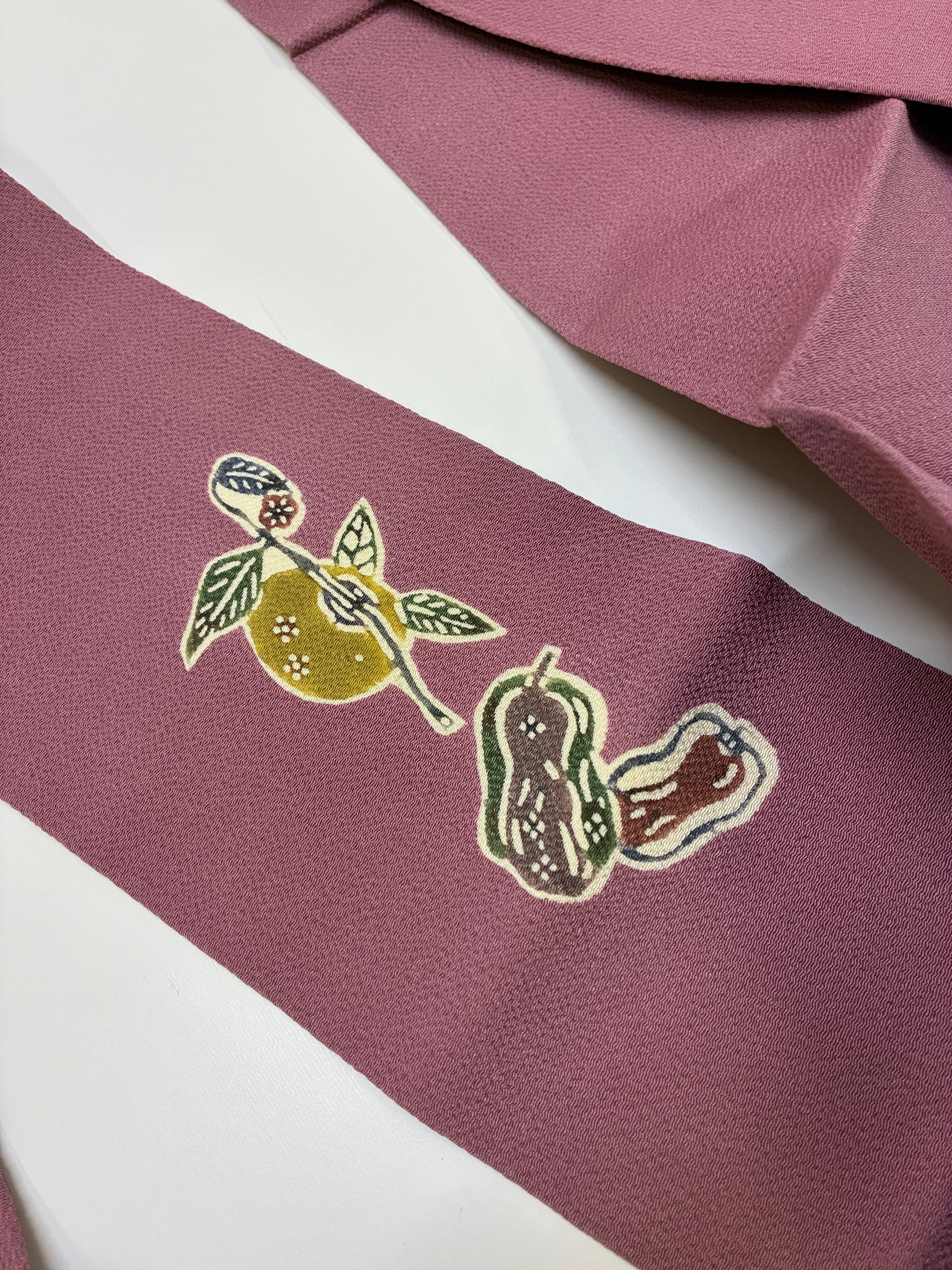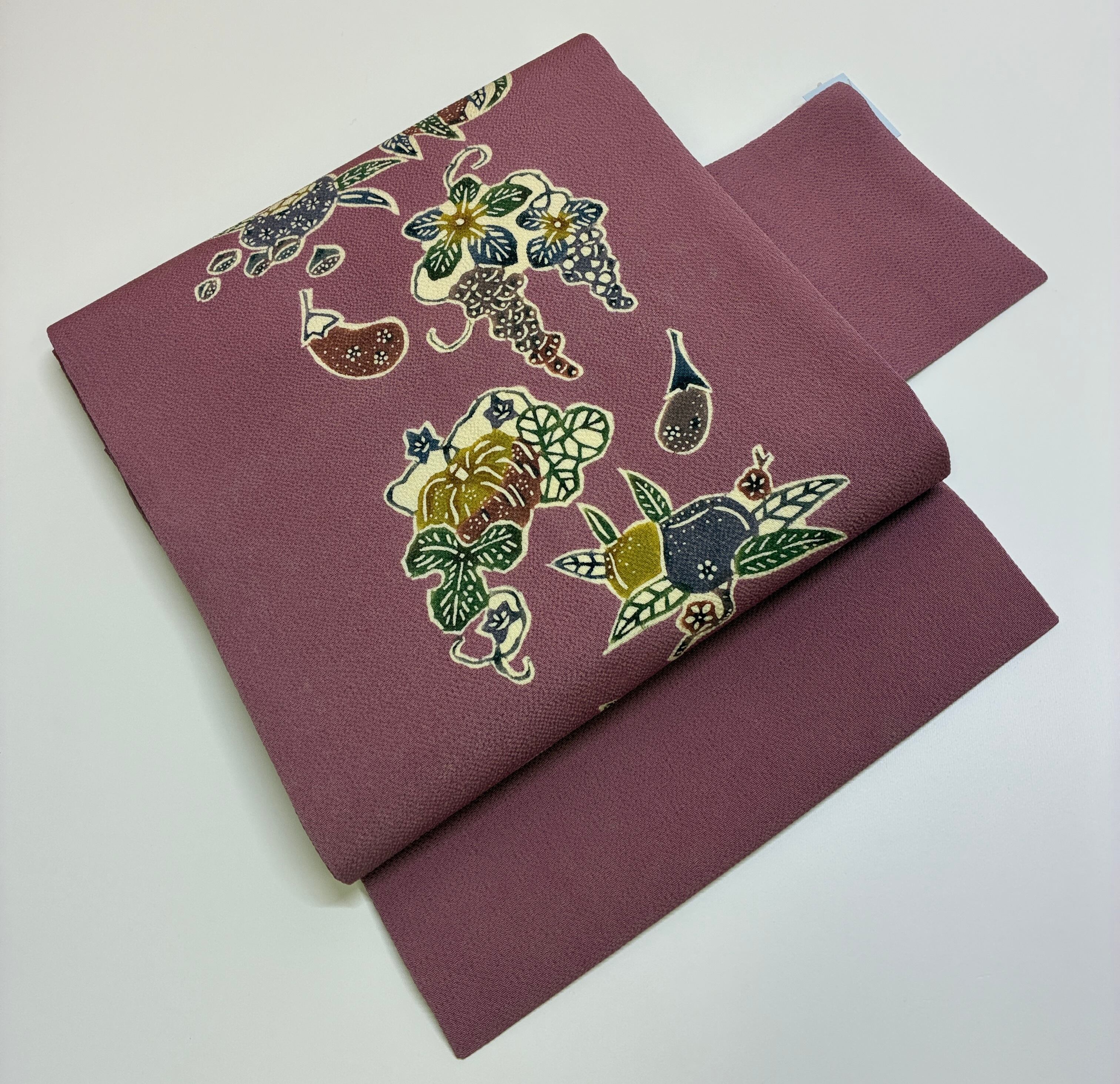繊細な縮緬地に、四季の草花を型染めで表現した名古屋帯。美しい色合いと優雅なデザインが特徴で、和装スタイルに華やかさを添える逸品です。紬、小紋など相性が良く、おめかし場面や普段使いにも最適です。
