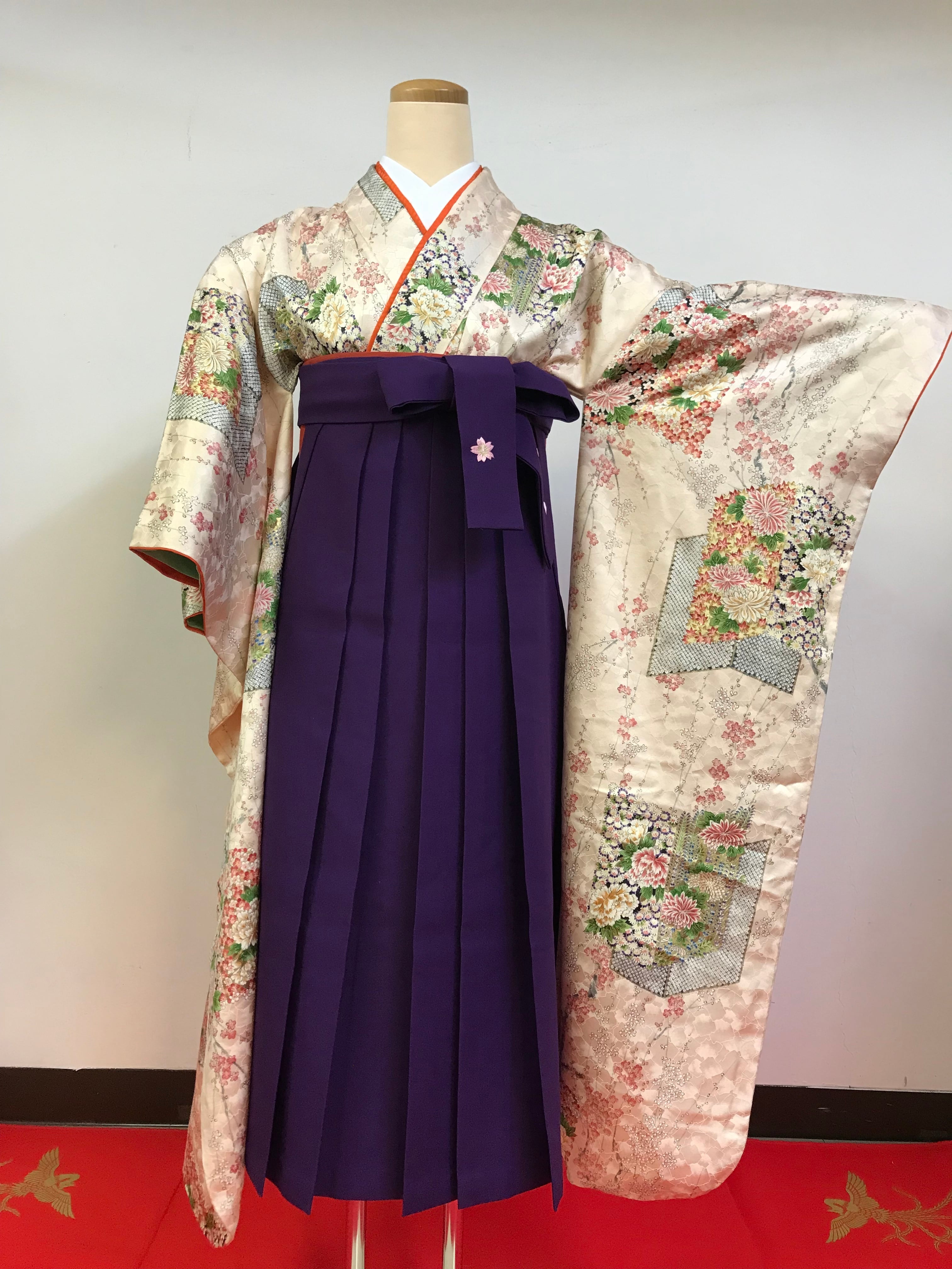 柔らかな金色地に美しい花柄模様の施された着物と気品のある紫色の袴の組み合わせです。全体的に落ち着いた印象でありながら、華やかさも兼ね備えています。全体的には良好な状態です。